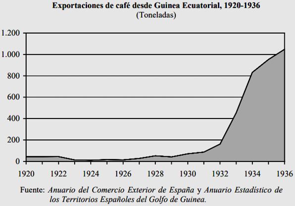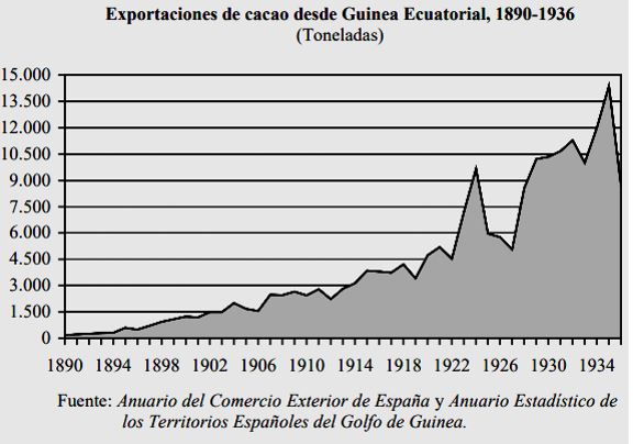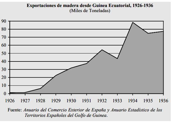 Aquest tres grafics corresponen al estudi “La formación del sistema economico colonial en Guinea Ecuatorial (1778-1936) realitzat per Fernando Carnero y Alvaro Diaz, estudi molt més ample i que recull també l’influencia en aquest procés economic, de capitals i empreses de la peninsula, i de les instal.lacions, vies i trens per als transport dels arbres, dels embarcadors…