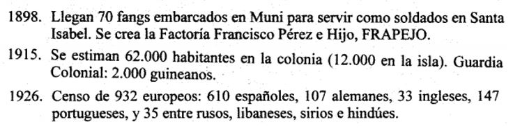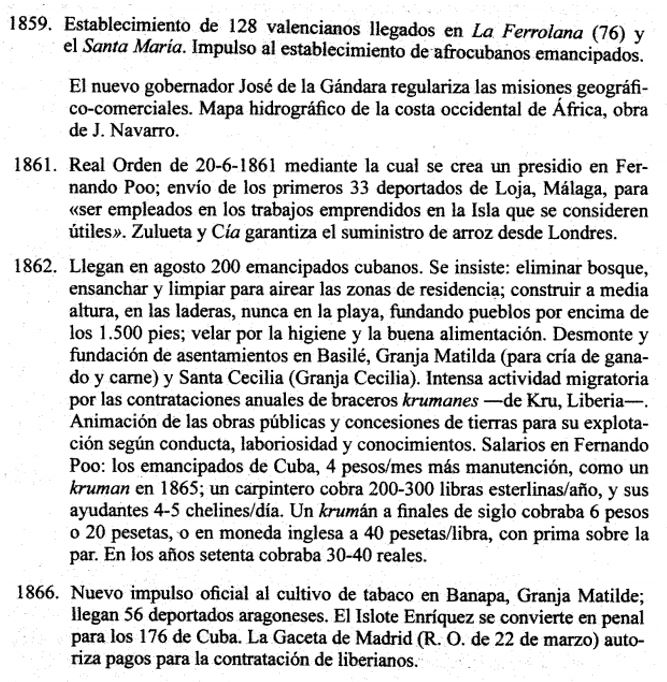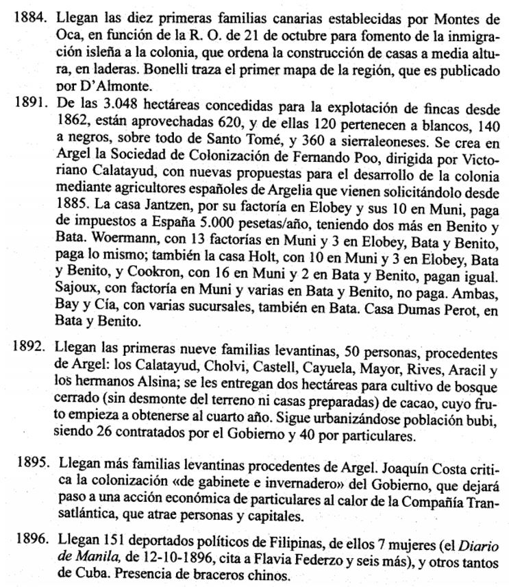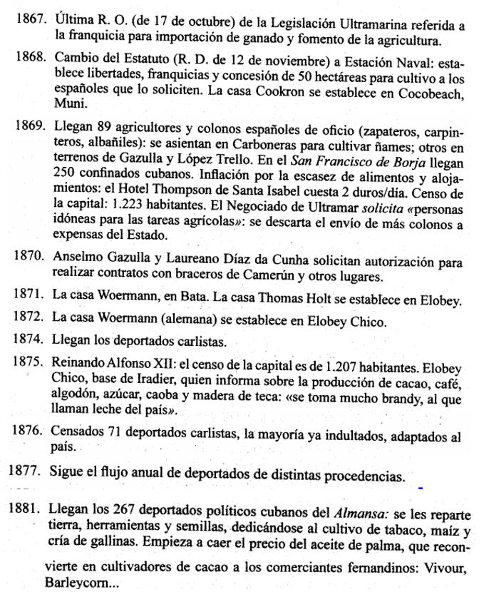 Un altra capitol a esmentar es l’evolució demográfica de la colonia, on veiem que es tracta s’un grup molt heterogeni, tant d’europeus (també d’empreses d’altres paisos que participen d’aquest creixement), com d’africans (alguns de paisos veins com a treballadors), o arribats d’altres destinacions, en el segle XIX; en Javier Morillas va recollir en un treball seu molt interessant, amb el nom de “Guinea Ecuatorial : un pais hispanico de raiz bantú”, on fa una cronologia de fets importants de la colonia, i del quan n’he extret la referencia a alguns anys, que tenen informació sobre l’origen de les persones que varen anar a establir-se (voluntaria o obligadament) :