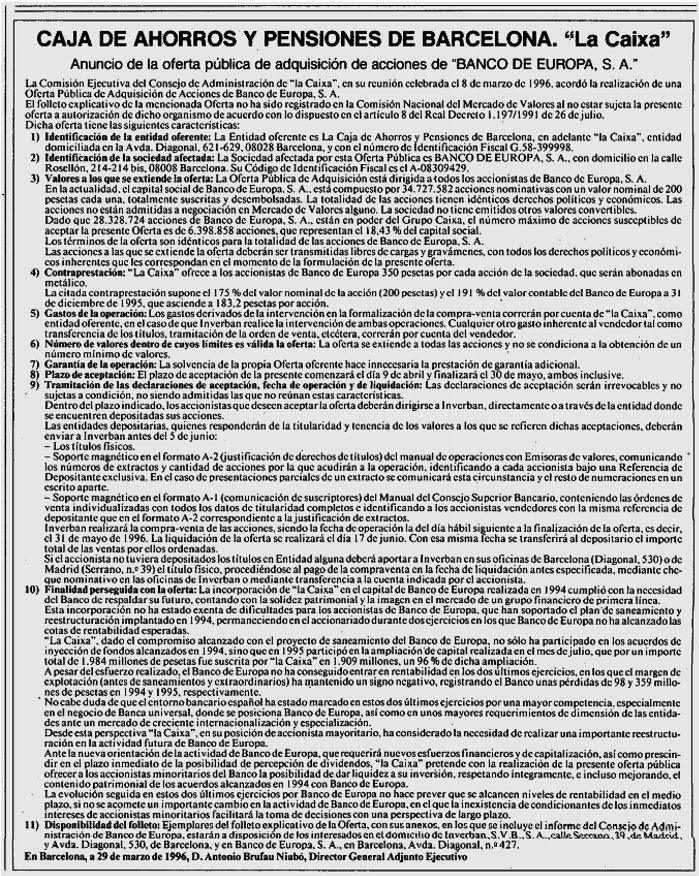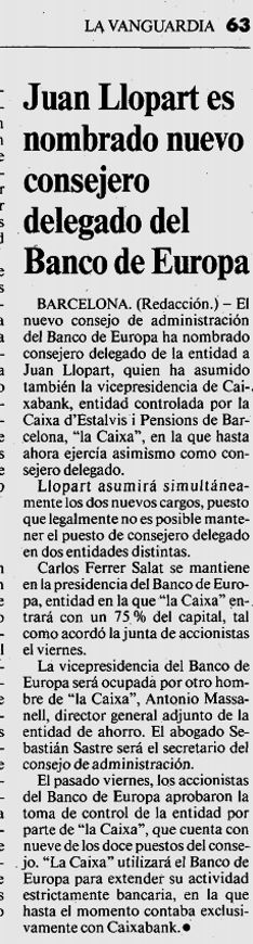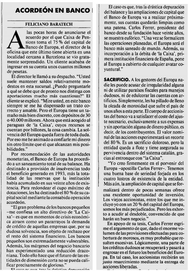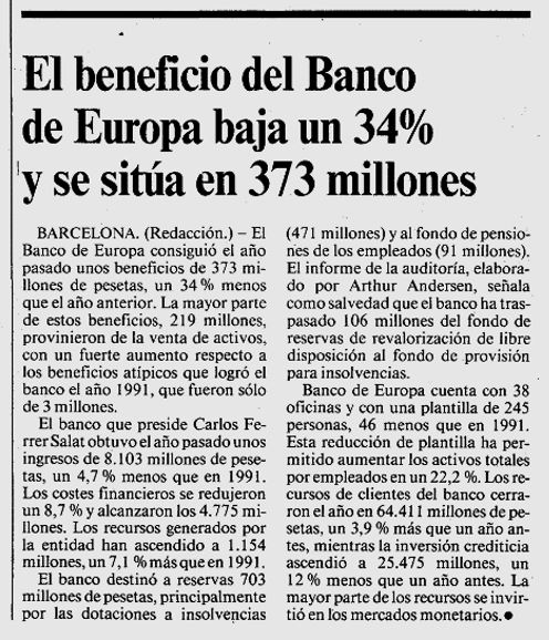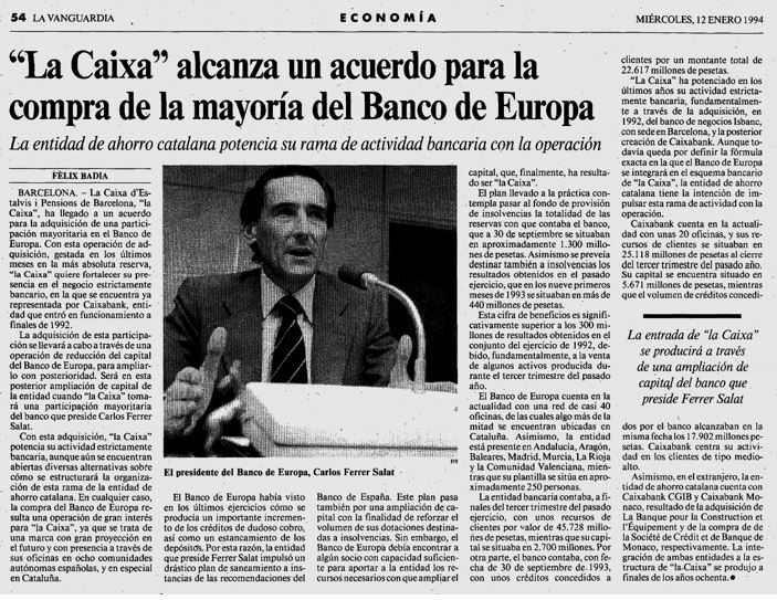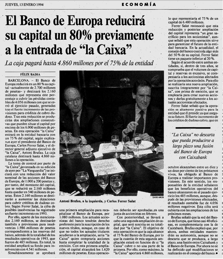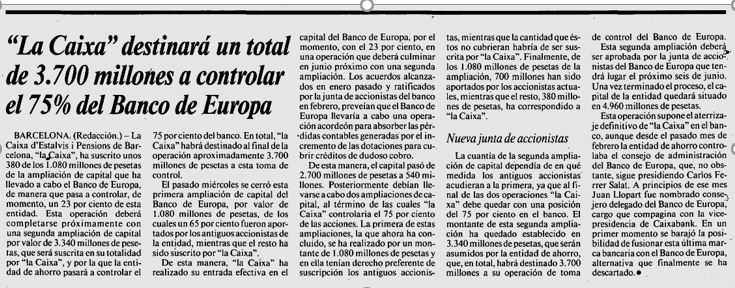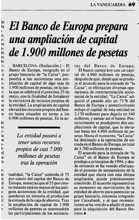 Per aixugar les perdues, el Banc redueix el capital i recursos de 2.700 a 540 mil.lions de pessetes, i es torna a capitalitzar amb una primera ampliació per 1.080 mil.lions (dels quals la Caixa en cubreix 380 mil.lions), i la resta es subscrita per els antics accionistes, i una segona ampliació de capital per 3.340 mil.lions de pessetes que es subscrita per la Caixa de Pensions, amb renuncia del seu dret per els anteriors accionistes. Això va suposar el recolzament de pertanyer a una entitat i grup més gran, malgrat que en cap moment es va publicitar com una absorció, sino que s’entenia que la Caixa tindria el 75 per dent del capital, i la resta d’accionistes el 25 per cent restant; el cert es que al cap d’uns anys la marca Banc d’Europa va quedar englobada i desapareguda dins de la Caixa de Pensions (ara Caixabank).