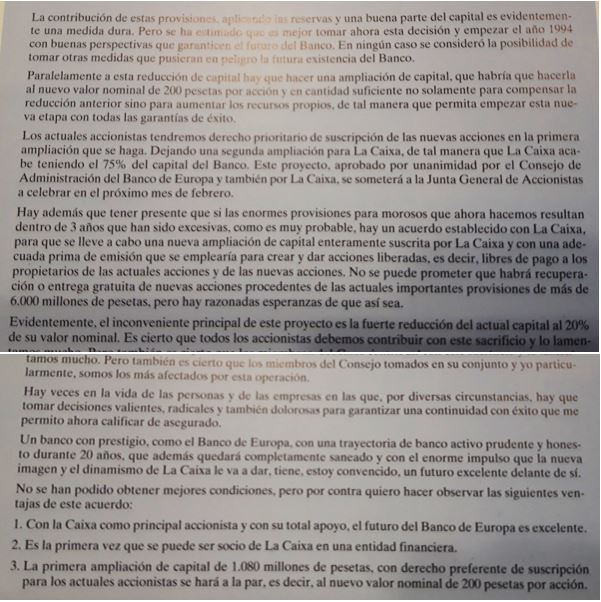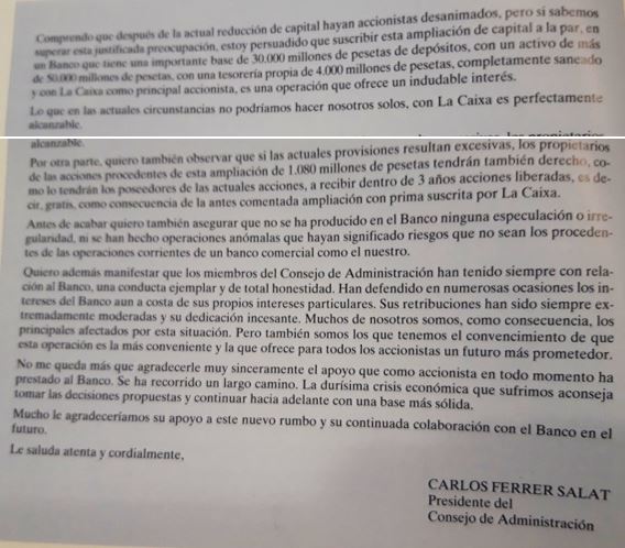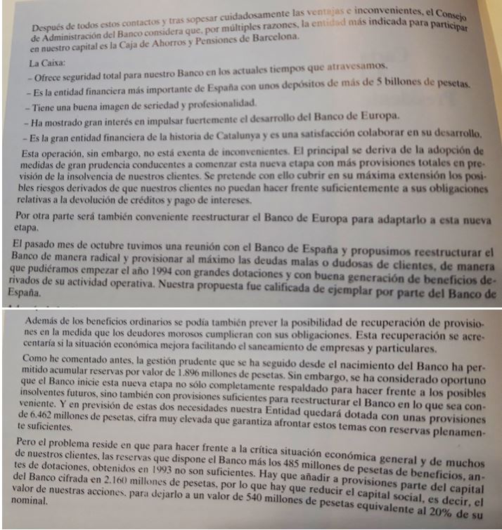 Crec que aquest es un document per a la nostra història economica, una entitat amb 20 anys d’historia, que cau en una crisi economica i unes perdues que el deixen descapitalitzat; però també va ser el somni i l’ilus.sió de molts botiguers, professionals i petits empresaris que varen fer confiança des de el principi, amb la subscripció d’accions, amb la operativa i vinculació amb les oficines, i amb la voluntat d’un banc que evolucionava sense tenir al darrera cap dels grups bancaris de l’epoca.