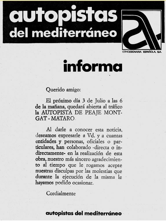 L’anunci i la fotografia que acompanyen aquesta entrada, ens recorden l’entrada en funcionament, fa 52 anys, dels peatges de les Autopistes de Mataro i Granollers, i el paissatge de les cabines amb sostre ataronjat s’ha fet comú en els nostres deplaçaments per al Principat.