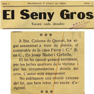 Només una noticia en el primer numero d’aquest setmanari montblanqui, per a fer esment d’aquest fet tragic, que d segur devia tenir un impacta en la societat de l’espoca.Malgrat la concrecció de la noticia editada, la publicació manifesta que no publica un detall extens del fet, que hauria aportat informació molt valuosa al respecte. Podem … More L112, – Josep Niubo Corbella, comptable de “Ferrer i Cia.” (D16)