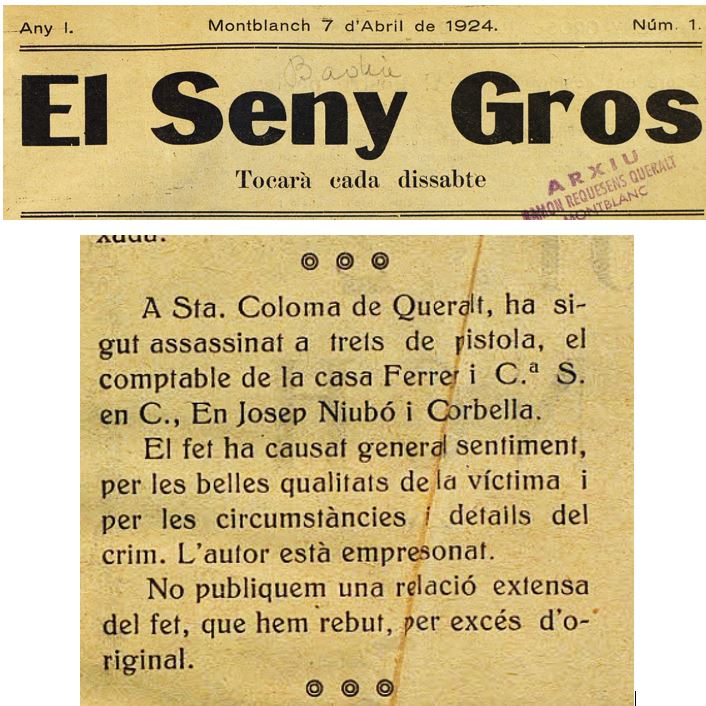 Podem deduir del que es diu, que el Sr. Josep Niubó va morir assassinat a trets de pistola, i que l’autor va ser agafat.
