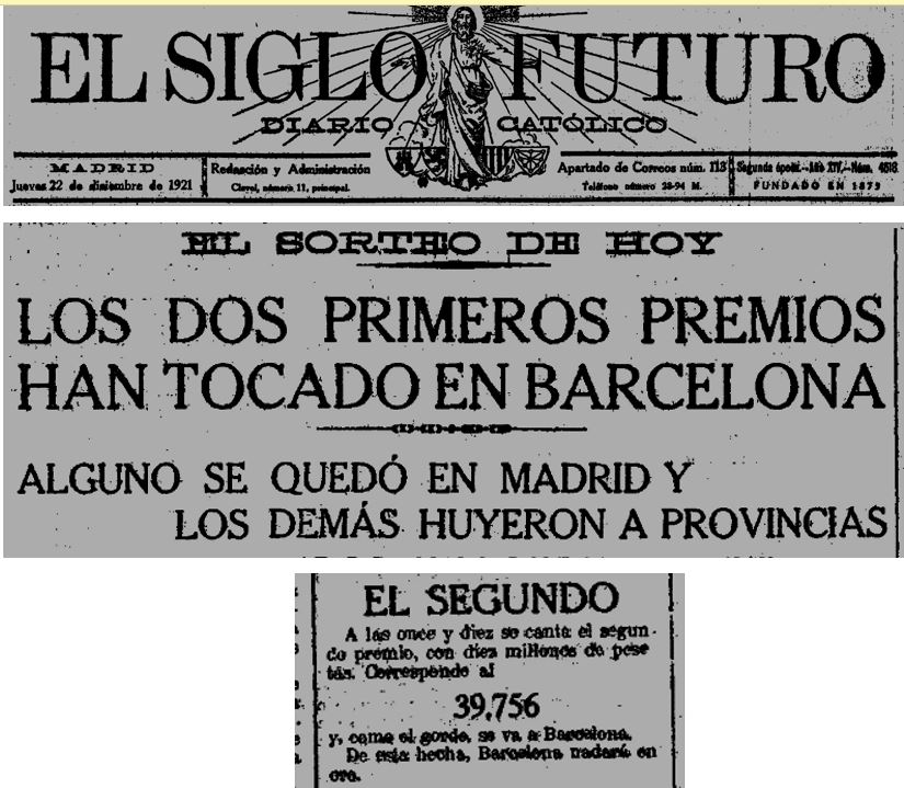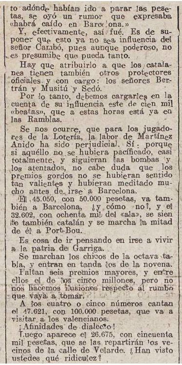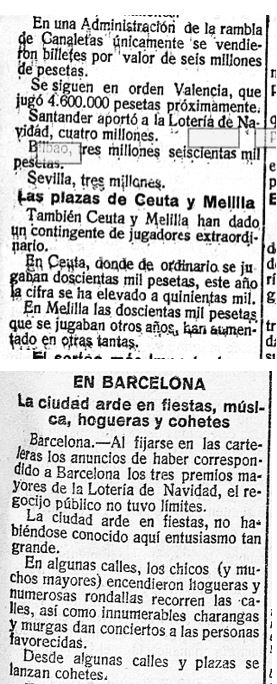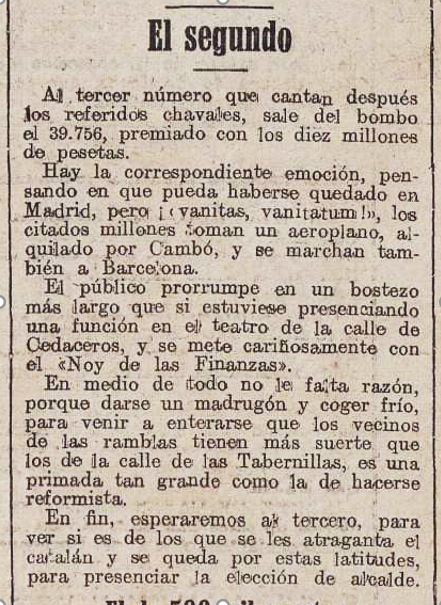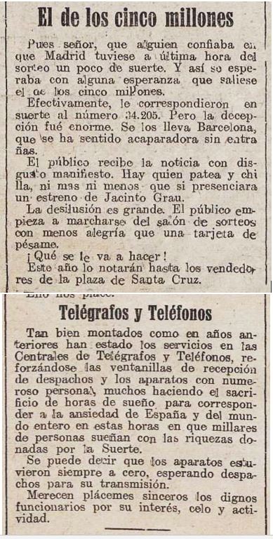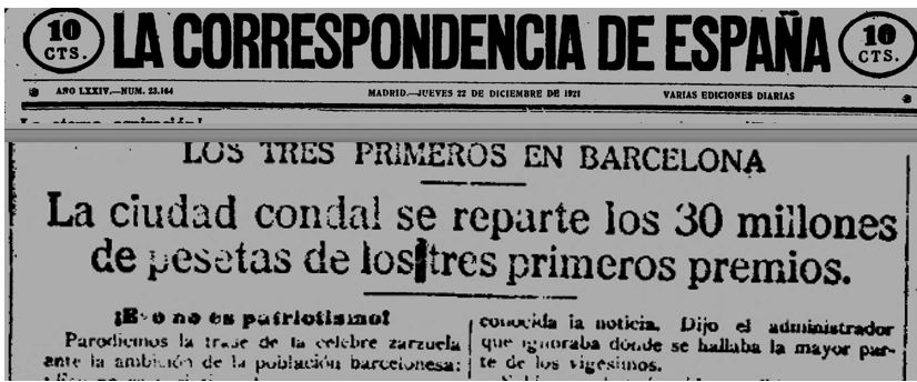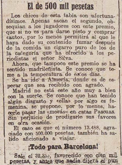 Especialment contundent va ser la premsa madrilenya, en constatar la desproporció dels premis arribats a Catalunya, envers els premis rebuts a la capital espanyola, especialment quan l’esperança dels premis s’anava esvaint a mida que anaven sortint; aquest recull seleccionat de la premsa de l’època ens apropa a les sensacons que reflectia, un sorteig esperat que generava il.lussions…