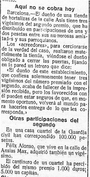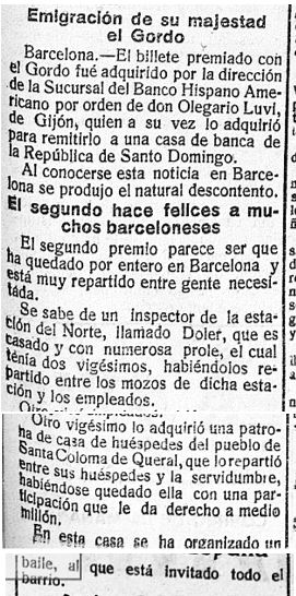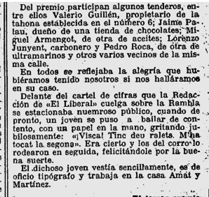 Malgrat de que ens quedaria pendent un estudi més profund de la forma en que els guanys de les diferents participacions varen tenir a nivell local, cal fer un esment de la repercussió que aquest premi va tenir a la premsa de l’època, perquè aquest sorteig va comportar que els tres primers premis fossin venuts en loteries de Barcelona (que no es el mateix de que els bitllets fossin adquirits per residents a la capital catalana).