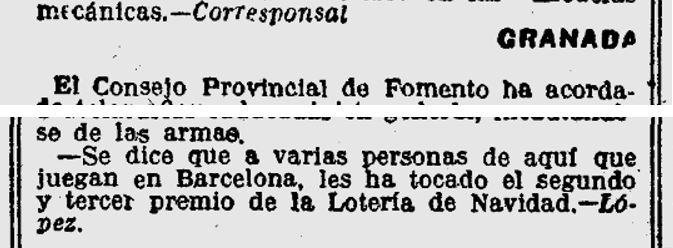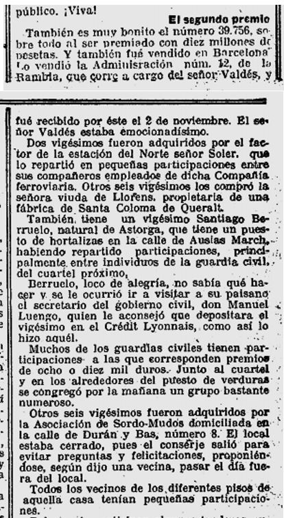 La revista, “La Segarra”, del mes de novembre ens recordava els noms dels afortunats que havien adquirit les participacions del número 39.756, que va sortir premiat amb el segon premi, fa 100 anys. Els números premiats varen ser adquirits per el senyor Ramon Llorens Marimon (que regentava la botiga de roba familiar), del carrer Major 12 (Santa Coloma de Queralt) i, en un dels seus freqüents desplaçaments qie feia a Barcelona, per raons de treball, subministraments a la botiga i altres, va adquirir 600 pessetes d’aquest numero 39.756.