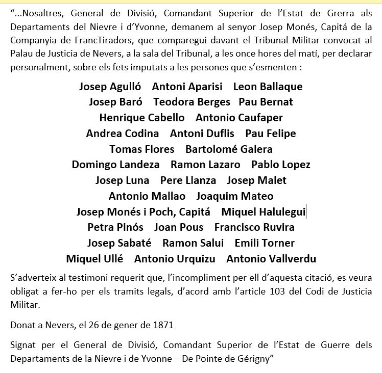 Aquesta entrada vol recordar els nom de 32 membres catalans i espanyols, què a les ordres del Capità Josep Monés i Poch, que al 27 de gener de 1871 varen ser requerits a Nevers, en un document que traduit diu :
