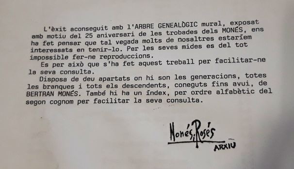 Com l’arbre què, en el seu dia, es va plantar a l’indret de “Monès”, en recordança dels orígens, l’arbre genealògic també ha anat creixent : noves generacions han nascut, d’altres joves han arrelat formant noves unitats, a prop o a indrets llunyans, i/o d’altres incorporacions han estat troballes o recerques que incorporem a aquesta història comuna.