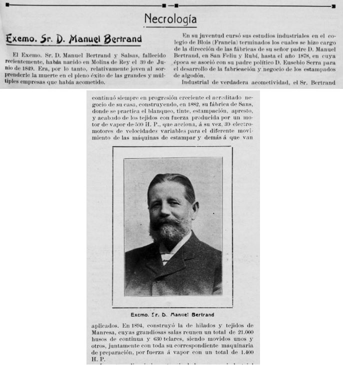 “Eusebi Bertrand i Serra, Industrial tèxtil cotoner, i politic, de familia d’origen occità; nascut a Barcelona, 22 de desembre de 1877 i mort a Barcelona, el 4 de juny de 1945.