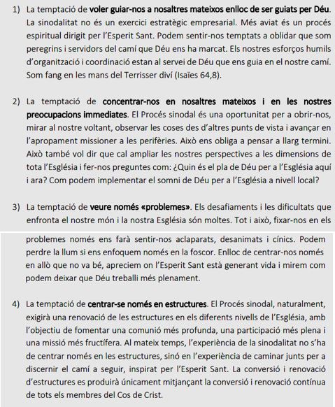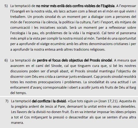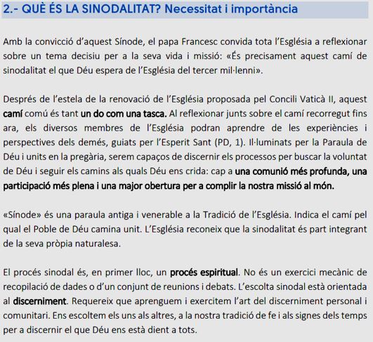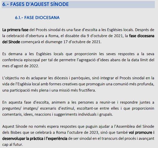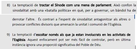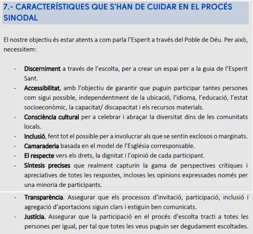 - Sembla ser que hi han unes qüestions definides sobre les quals es demana l’opinió, però no totes les comunitats parroquials han tingut el mateix recorregut i la mateixa sensibilitat en la seva històriai, per tant, no es garanteix el respecte a l’opinió discrepant, o a les particularitats locals o comarcals.