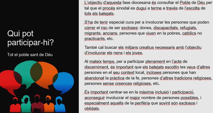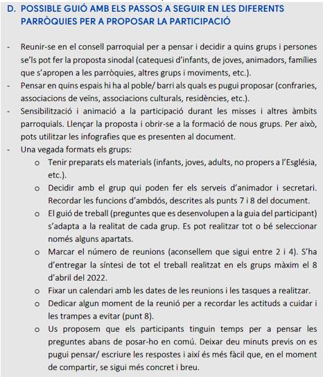 - Participar vol dir fer-ho amb calma, en diferents reunions i permetre la reflexió entre trobades sinodals.