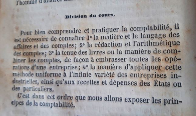A la pàgina 4, en un apartat, proposa com es distribueix el curs, i que traduit diria : “Per comprende bé i practicar la comptabilitat, es necesari de conèixer 1er. la matèria i el llenguatge dels negocis i dels comptes, 2on. la redaccó i l’aritmètica dels comptes, 3er. com portar els llibres comptables i la manera de combinar els comptes, de cara a relligar totes les operacions d’una empresa 4rt. la manera d’aplicar aquest mètode uniforme a la infinita varietat d’empreses industrials, tant que siguin de l’estat com de particulars…”