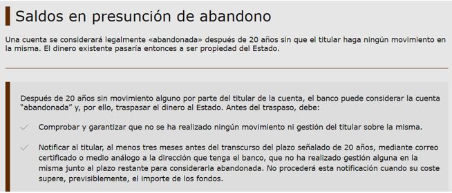 La Llei 33/2003 del Patrimoni de l’Estat, determina el procediment i terminis; és cert que el Banc pot avisar però, transcorreguts 20 anys, és possible que el client no hagui comunitat un canvi de domicili, o per desconeixement dels hereus es puguin trobar aquest tipus de situacions.
