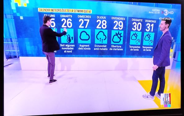 El divendres passat al programa de tarda “Tot es mou” d’aquesta cadena de televisió, va sortir una infografia, respecte a la previsió del temps que faria la setmana entrant (o sigui aquesta), la qual reproduim.