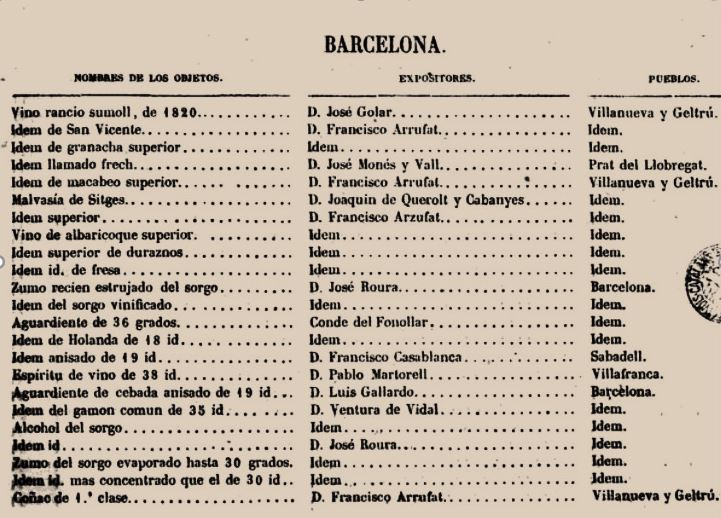 El fet de presentar els seus productes a aquesta “Exposició, Nacional”, haver estat seleccionats els seus productes, denota una qualitat; si veiem el full de Barcelona reproduit, coneixe’m que es tracta de “Vino” (com es veu a la primera linia) i despres amb el idem van reproduint aquest producte. Es curios que no hi hagi altre producte amb un nom semblant.