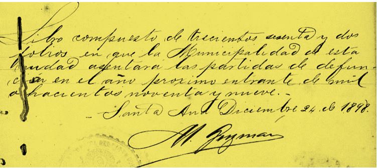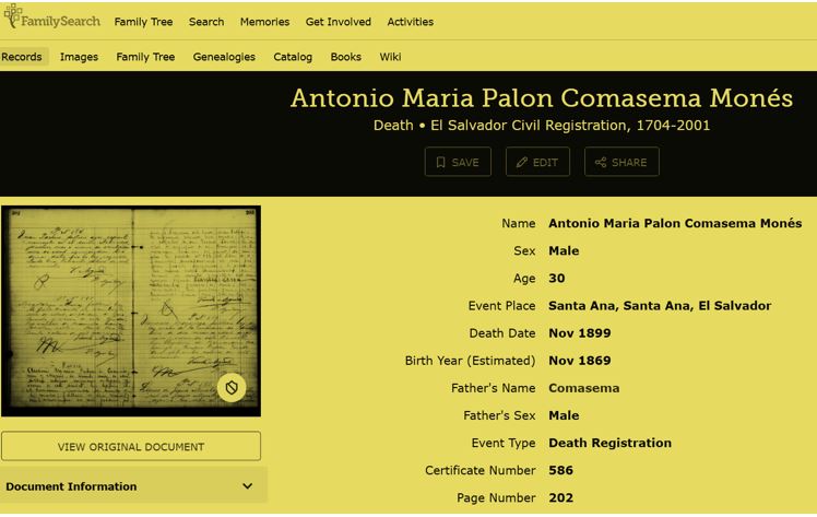 “…Antonio Comasema de treinta años de edad, soltero, originario de España y vecino de esta ciudad, hijo legitimo de N. Comasema, falleció ayer a las cinco de la tarde de un balazo. Santa Ana, diciembre primero de mil ochocientos noventa y nueve…”