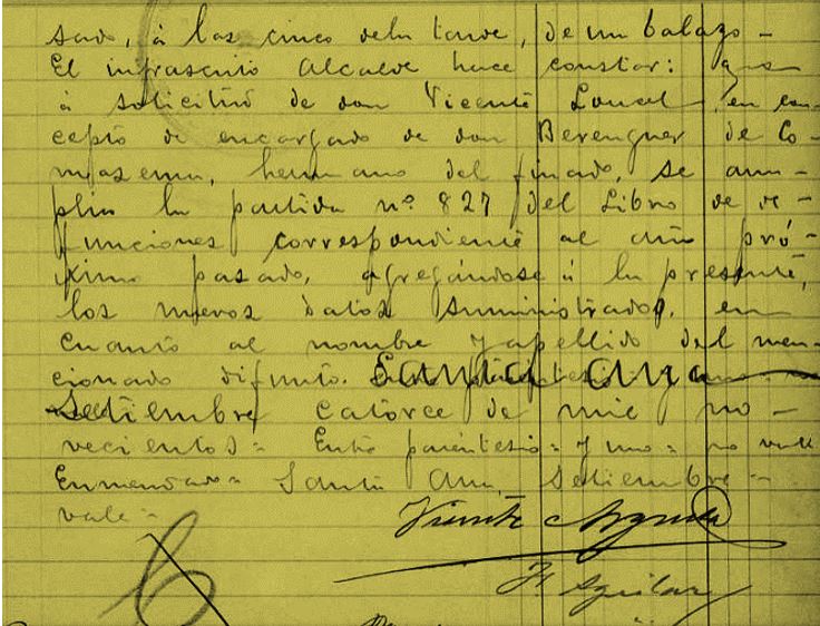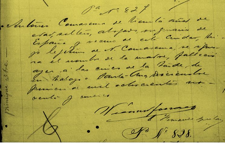 “…Antonio Maria Palou de Comasema y Monés, de treinta años de edad, soltero, abogado, originario de España y vecino de esta ciudad, hijo legitimo de N. Comasena, ignorandose el nombre de la madre, falleció el dia treinta (y uno) noviembre del año próximo pasado, a las cinco de la tarde, de un balazo. El infrascrito Alcalde hace constar : que a solicitud de D. Vicente Luncil (¿) en concepto de encargado de D. Berenguer de Comasema, hermano del finado, se amplia la partida 827 del Libro de Defunciones, correspondiente al año próximo pasado, agregándose a la presente los nuevos datos suministrados, en cuanto al nombre y apellido del mencionado difunto. Santa Ana, setiembre catorce de enero de mil novecientos. Santa Ana setiembre vale…”