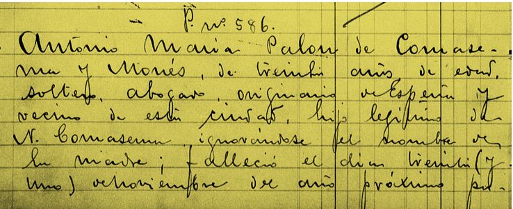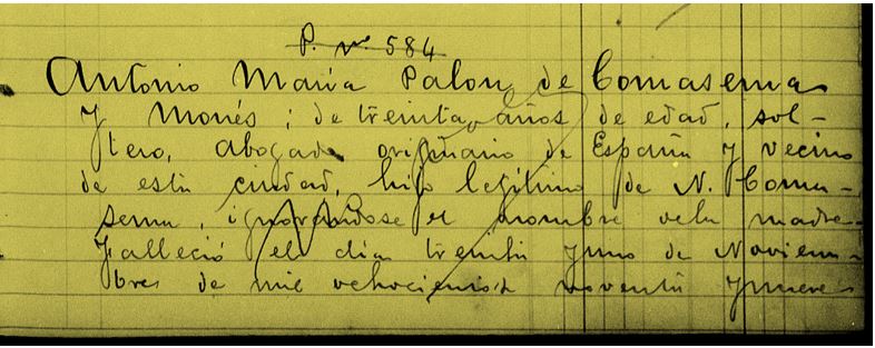 “…Antonio Maria Palou de Comasema y Monés, de treinta años de edad, soltero,abogado, originario de España y vecino de esta ciudad, hijo legitimo de N. Comasema, ignorandose el nombre de la madre, falleció el dia treinta y uno (?) de noviembre de mil ochocientos noventa y nueve…”