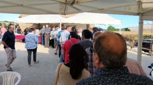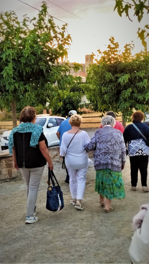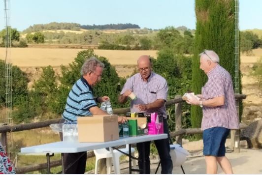 Després, el berenar : un entrepà, una beguda i un pastisset rodó, que tots degustem informalment, i on l’ordre de les cadires i les converses, es va conformant al llarg de l’espai, i de la barana de pedra que voreja l’entorn.