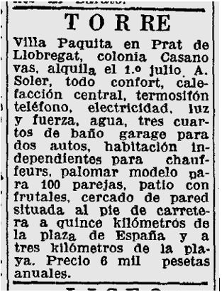 Un segon anunci, inserit a l’edició del diumenge 5 de maig de 1929 (pàg. 40), ja ens dona detalls de la mateixa : “todo confort, calefacción central, termosifon…garage para dos autos, habitación independientes para chauffeurs…”, i sobre tot la seva ubicació a la “Colonia Casanovas”, però també d’un “palomar para unes 100 parejas”, que segurament seria on tindria ubicada la seva granja de colomins.