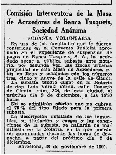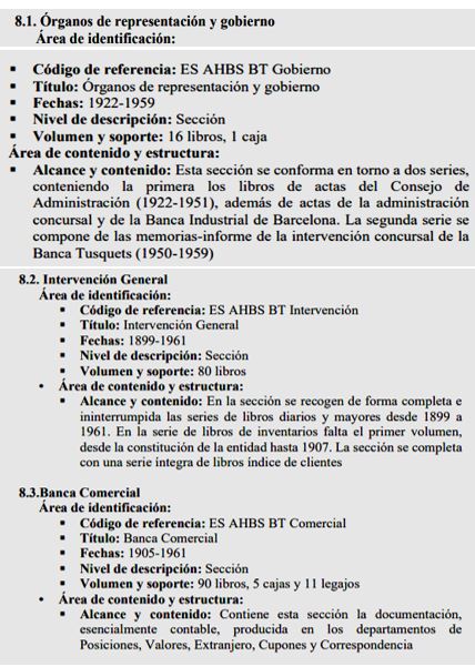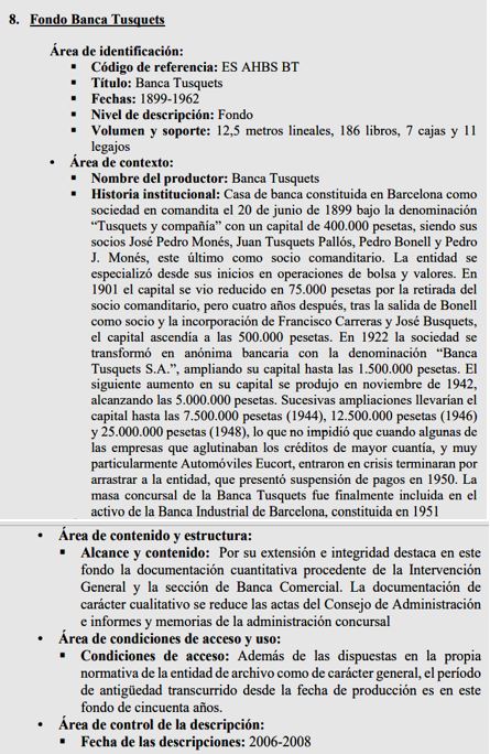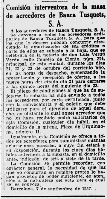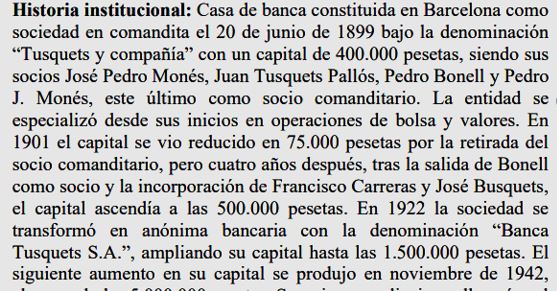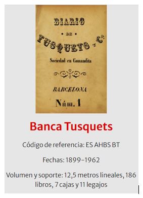 1962 : Tota la documentació consultable d’aquesta entitat, es troba al “Archivo Histórico del Banco de Santander” (que es troba a Solares – Cantabria), hi ha un apartat corresponent a aquesta Banca Tusquets, que la va absorbir l’any 1962 (Imatge ).