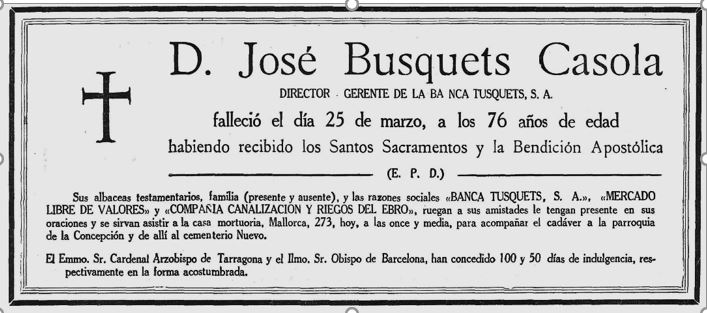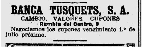 De la Banca Tusquets, hi ha molt poca informació, llevat d’anuncis d’operacions de títols, en que hi participava aquesta entitat, juntament amb les altres de Barcelona, en la primera meitat del segle XX.