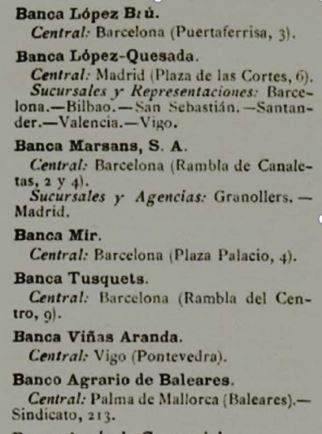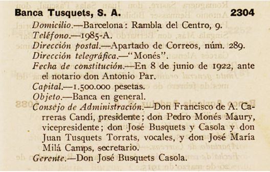 1923 : En aquesta ressenya, es fa constar que en Pedro Monés n’és el Gerent (Imatge 8); en algunes informacions es refereixen a la “Banca Busquets”, segurament per haver-hi membres amb cognoms Busquets i Tusquets.