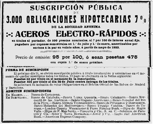 1921 : Part d’un anunci de l’emissió d’Obligacions Hipotecàries del “Hotel Ritz de Barcelona”, on a l’entitat “Tusquets y Compañia, S. en C”, es poden subscriure aquests titols (Imatge 3), una altra emissió del mateix mes de Juliol, de l’empresa “Sdad. Anónima de Aceros Electro Rápidos”, on també intervé en la susbscripció d’aquests titols (Imatge 4), i d’una conversió de Bons de la “Barcelona Traction” (Imatge 5)