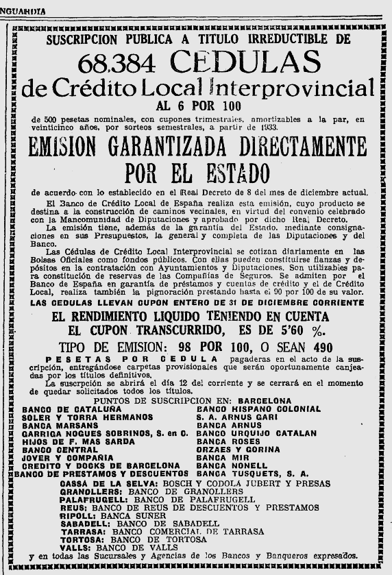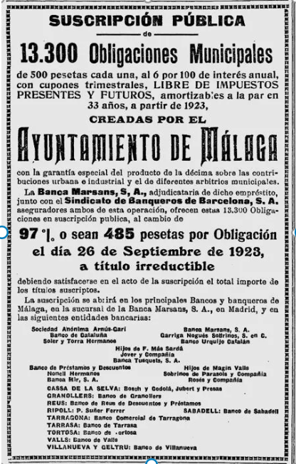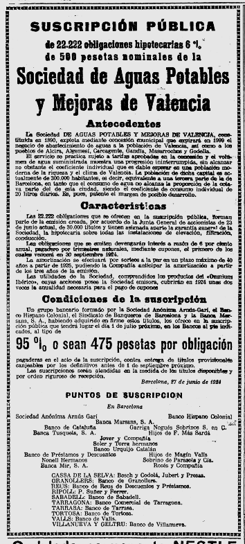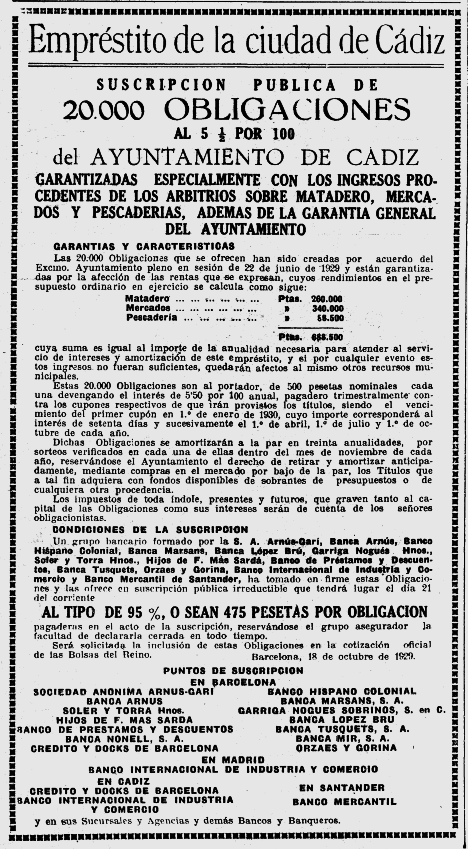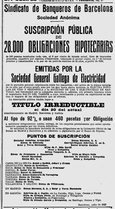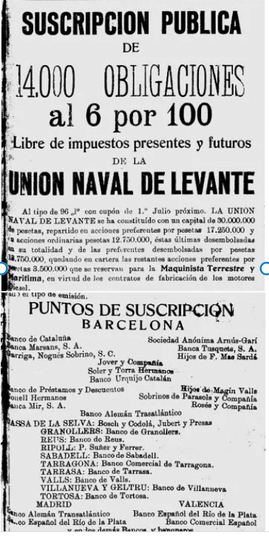 1923 : i principalment els anys 1925 i 1926 continuaran intermediant en la suscripció de les principals emissions corporatives (Imatges 9 a 11), igual que als anys 1929 i 1930 (Imatges 11 i 12); és nomes una selecció d’anuncis d’aquesta epoca