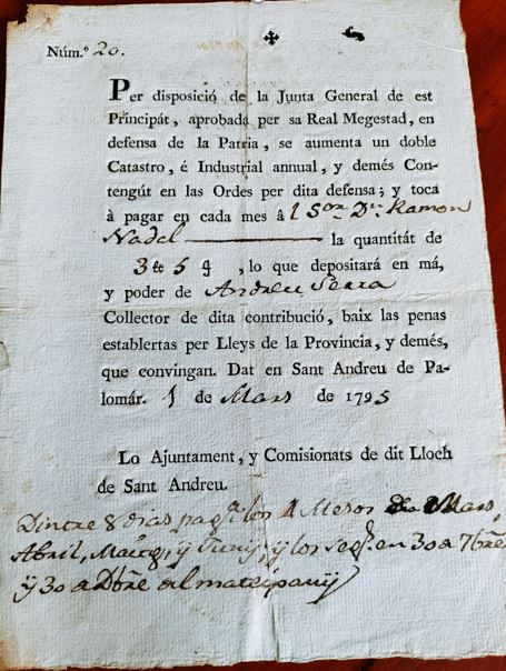 a) Segle XVIII : la comunicació d’un “doble Catastro, e Industrial annual”, a l’Ajuntament de Sant Andreu del Palomar (avui Barcelona), les contribucions o comunicacions de forma massiva utilitzen una part impresa, i només cal anotar-hi cada destinatari. En aquest cas també fa funció de rebut ja que al darrera hi han anotats alguns dels pagaments fets per aquest concepte :