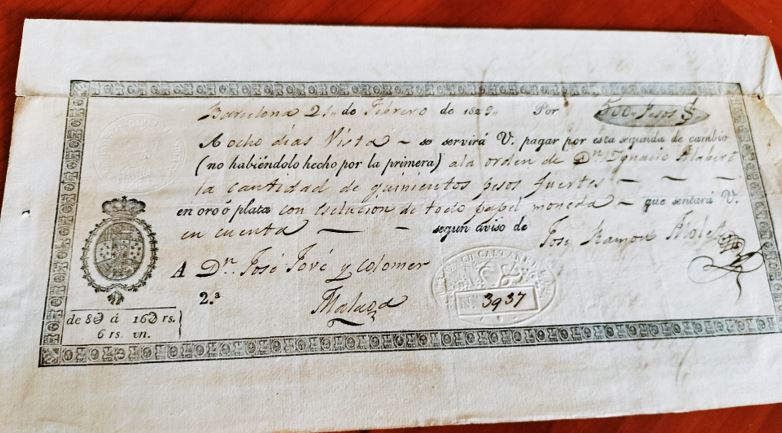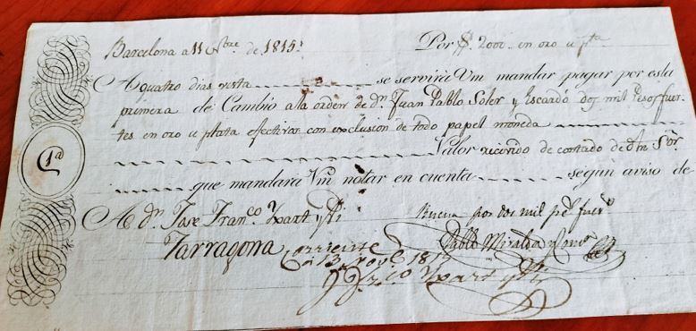b) Començaments del segle XIX : les lletres de canvi utilitzen formats que no es modificaran sustancialment fins a la desaparició d’aquest document; en aquests dos exemples hi han lletres de 1815, i una segona de 1829, en que ja incorpora el segell de l’estat i el gravamen, segons l’import :