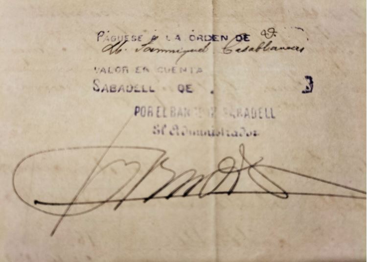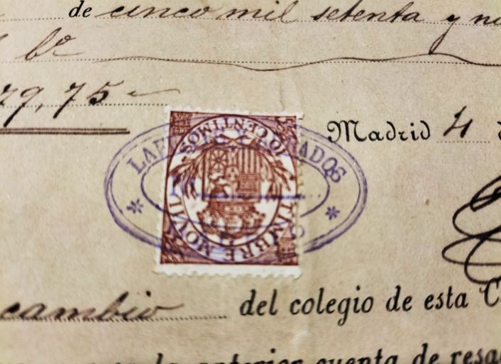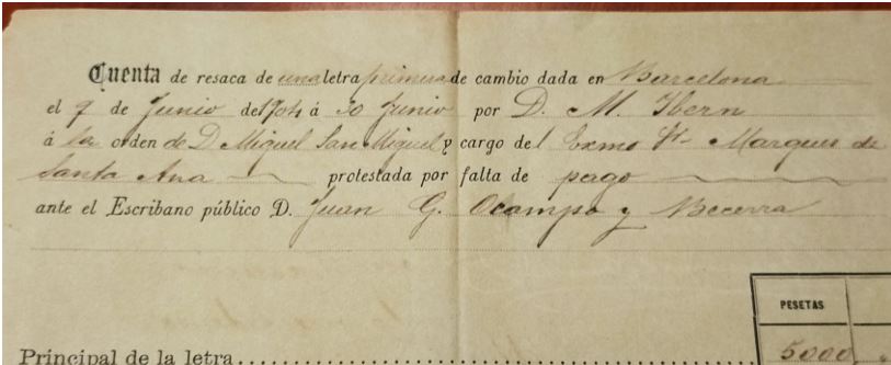 A la col.lecció tinc aquest exemplar que correspon a l’any 1904; és una lletra de canvi impagada per part del Marques de Santa Ana (Madrid), emesa a Barcelona por “M Ibern” a l’ordre de “Miguel Sanmiguel”, i hauria estat protestada per el “Escribano Publico D. Juan G. Ocampo y Becerra”.