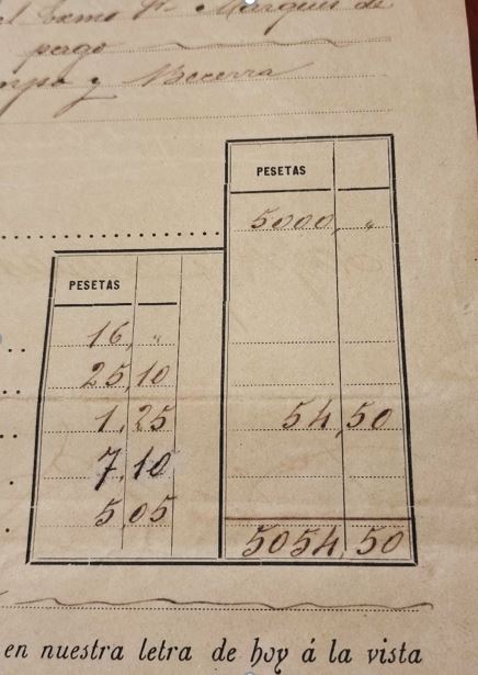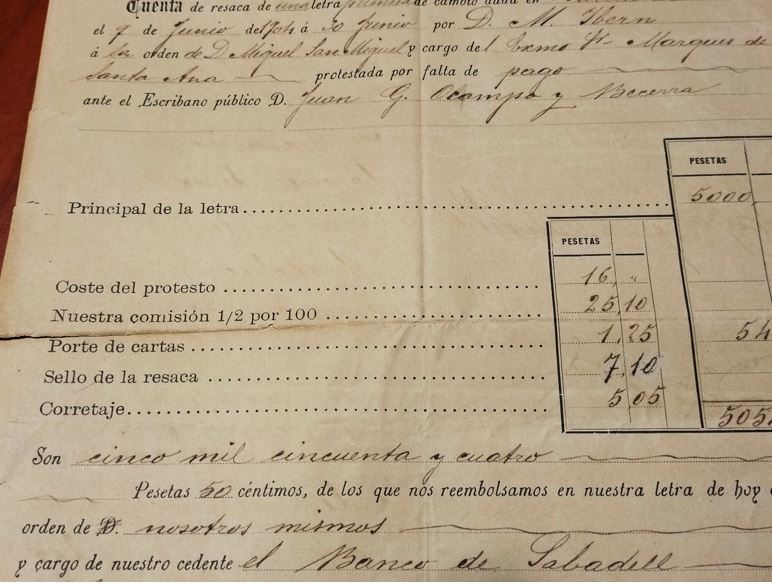 El nominal es de 5.000 Ptes, i si ha d’anar sumant les despesesdel document notarial d’impagament (16,00 Ptes), la comissió de qui signa la compte de ressaca (1/2 per cent = 0,50 %) (25,10 Ptes.), el “porte de cartas” que correpondria a l’enviament per carta postal, o per enviament d’algun empleat a fer la gestió (1,25 Ptes), el sello de la resaca (7,10 Ptes), i el “corretaje” que es la remuneració que percep el corredor per els seus serveis o intervenció (5,05 Ptes), en total el deute serien les 5.054,50 Ptes. que hi consten.