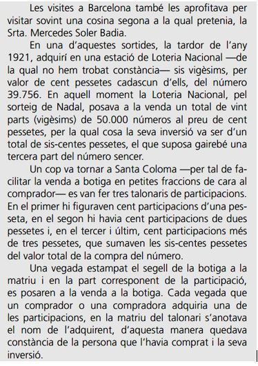 Una hipotesi poc fiable seria que s’hagués comprat aquesta participació, amb un altra veí, però semblaria més coherent d’haver agafat dos participacions d’una pta;una altra altra hipotesi seria que la persona que li va vendre la participació, conegués el nom de la persona i, per el seu compte, hi incorporés els cognoms. Segurament els compradors, en aquest establiment, serien coneguts i habituals; el sol fet de constar el lloc de La Cirera, ja ens ratificaría aquesta coneixença.