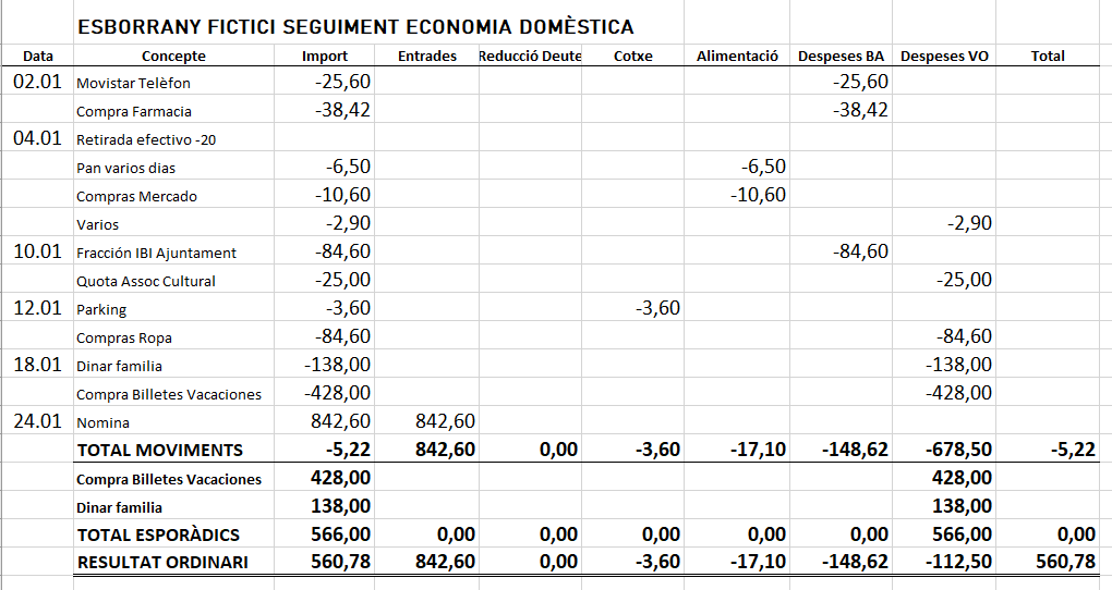 - Amb la resta de les dues quantitats, tinc dos resultats : el Ordinari (Total – Esporàdics) i Total final (resultat de caixa = el que ha sortit de la butxaca.