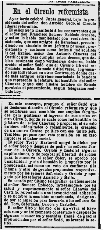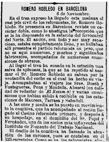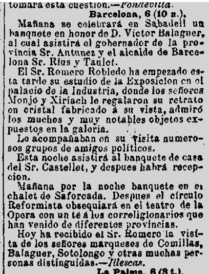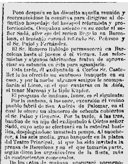 1887 : Consta com a domicili, el carrer Cucurella 5 de Barcelona (Imatge 8), i en la visita i diferents activitats del Sr. Romero Robledo, a Barcelona, ofereix un sopar a casa seva (Imatge 9).