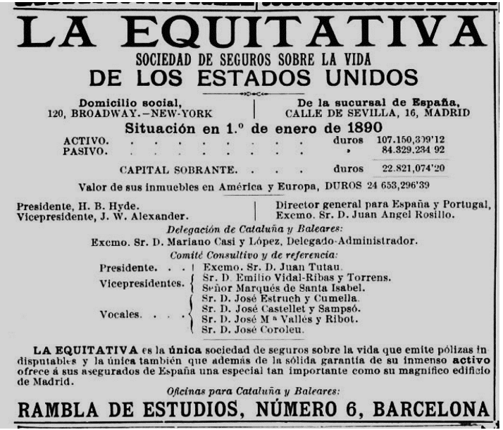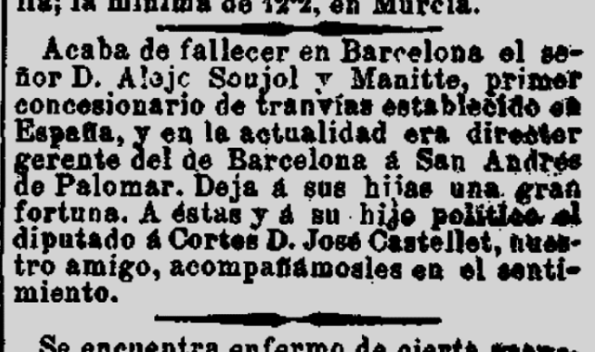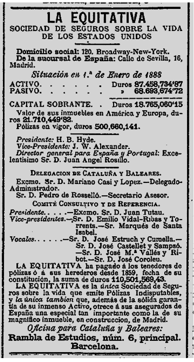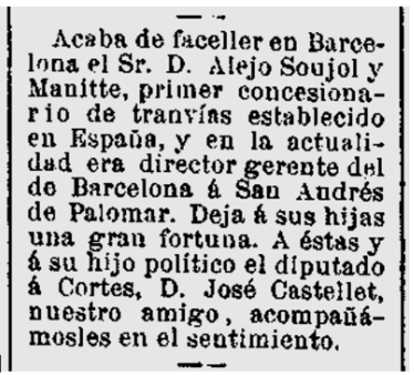 1888 : Té com a adreça el carrer Duque de la Victoria 13 (Barcelona) (Imatge 10); en un Ball organitzat al Teatre Principal a Benefici de l’Hospital de la Santa Creu, hi assisteixen Elisa i Maria Soujol, i també assistiran a altres esdeveniments de la societat de l’època, segons consten als diaris (Imatge 11); en una nova visita del Sr. Romero Robledo organitza un sopar a casa seva. Apareix en una serie d’anuncis del mateix format, com a Vocal del Comité Consultiu i de referència de la Delegació a Catalunya i Balears de “La Equitativa”