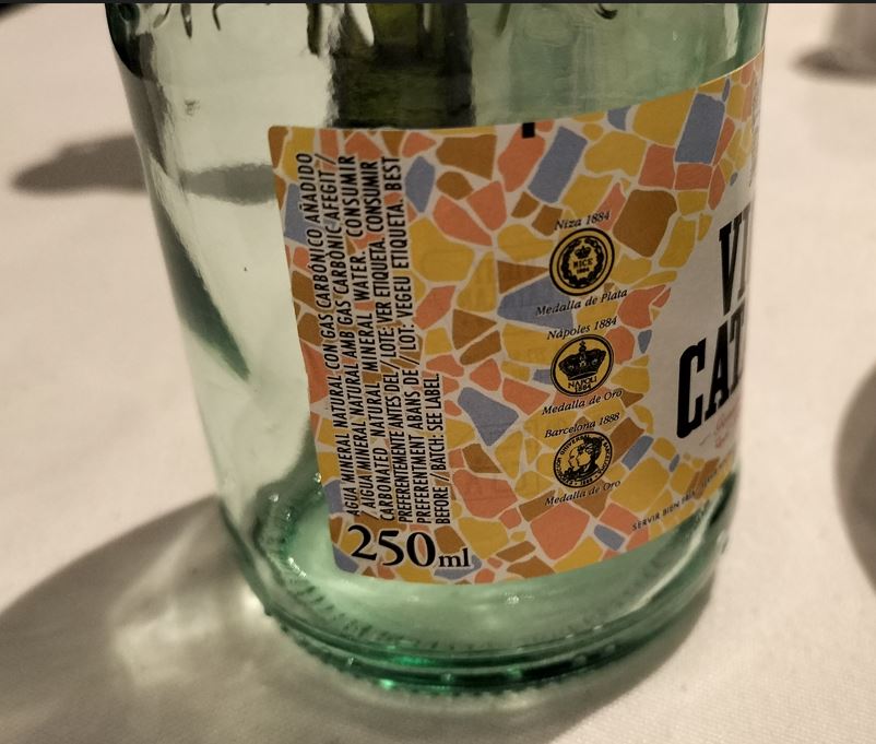 Aquesta darrera setmana vaig anar a un restaurant de Santa Coloma i, al demanar una beguda d’aigua amb gas, hem vam oferir aquesta ampolla que he reproduït, amb una capacitat de 250 ml (el que hi cap en una copa)