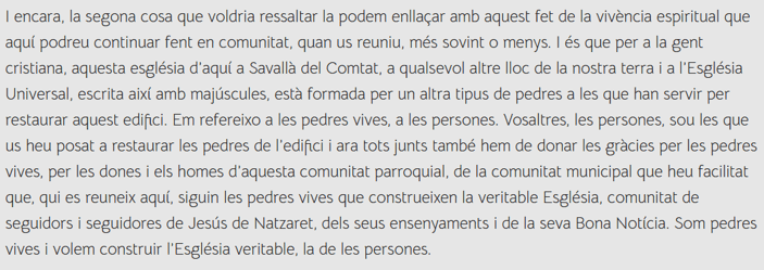 Potser una de les noticies que va posar en boca de tots Savallà, va ser l’enfonsament de la teulada de l’Església de Sant Pere Apòstol, al mes de setembre del 2019, reinagurada per el Bisbe Planelles l’octubre de 2021, on feia esment de la comunitat viva, i de la simbologia que feia amb les pedres vives :