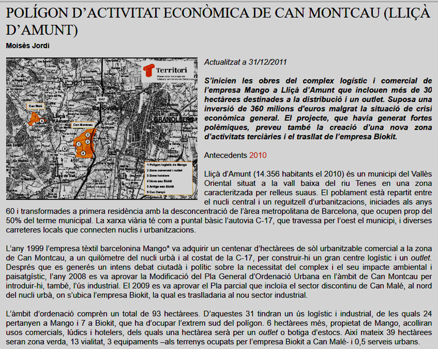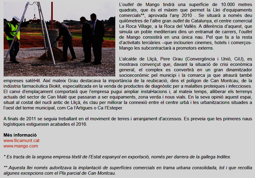 d) “A final del mateix mes es va presentar el Pla estratègic de Lliçà d’Amunt en el qual s’assegurava que el desenvolupament del complex logístic de Mango oferiria grans oportunitats al municipi. En concret l’estudi afirmava que, a part de la incidència directa en la creació de llocs de treball, hi haurien beneficis indirectes en ocupació vinculats als serveis, el lleure i el turisme rural”…; seria necessari un estudi actualitzat, però el cert es que a nivell de botigues i comerciants dins de l’entorn del poble, aquest ha anat minvant, i les franquicies que hi son des de fa 10 anys son les mateixes.