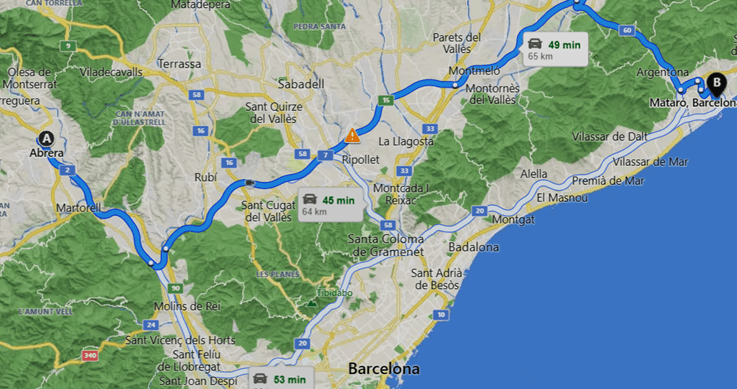 2x Si mirem algunes de les distàncies actuals en Km. són : d’Abrera a Granollers : 49 Km; d’Abrera a Sabadell : 30 Km; d’Abrera a Lliçà Amunt – 50 km; o d’Abrera a Mataró : 64 Km (dades consultades a la web “distanciasentreciudades.com”).En els dos mapes adjunts es poden veure, visualment. dos dels recorreguts recomanables, per fer les rutes actuals :