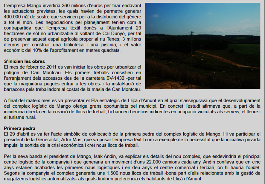 e) “Per la seva banva, el President de Mango…el principal centre logístic…que generaria 1.500 nous llocs de treball…als quals tindrìen preferència els habitants de Lliçà d’Amunt”; no tinc dades actualitzades, però un matgatzem totalment robotitzat dificilment podria tenir un volum de personal, encara que tingués un funcionament de 24 hores.