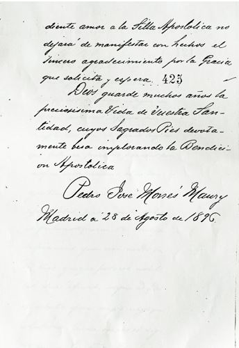 TRANSCRIPCIÓ : … ardiente amor a la Silla Apostólica no dejará de manifestar con hechos el sincero agradecimiento por la Gracia que solicita y espera / Dios guarde muchos años la preciosísima vida de vuestra Santidad, cuyos sagrados Pies devotamente besa implorando la Bendición Apostólica / Pedro José Monés Maury / Madrid a 28 de Agosto de 1896