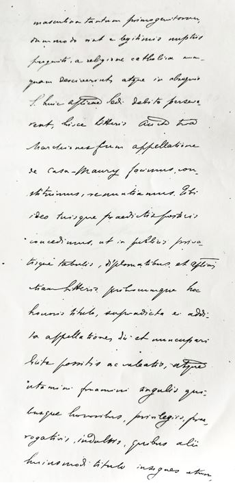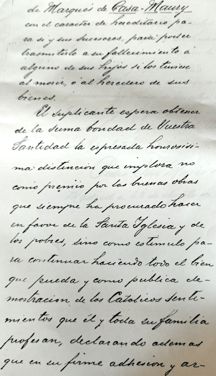 TRANSCRIPCIÓ : …de Marqués de Casa Maury con el carácter de hereditario para sí, y sus sucesores, para poder transmitirlo a su fallecimiento a alguno de sus hijos si los tuviese al morir o, al heredero de sus bienes. / El suplicante espera obtener de la suma bondad de Vuestra Santidad la expresada honrosísima distinción que implora, no como premio por las buenas obras que siempre ha procurado hacer en favor de la Santa Iglesia y de los pobres, sino como estímulo para continuar haciendo todo el bien que pueda y como pública demostración de los católicos sentimientos que él,y toda su familia profesan, declarando además que en su firme adhesión y ardiente…