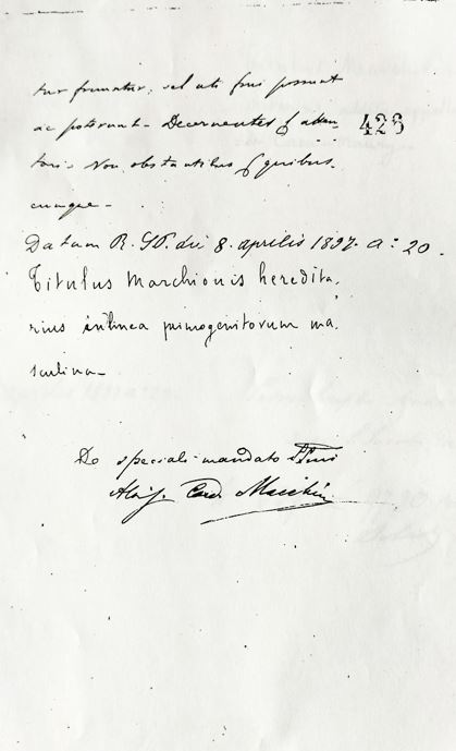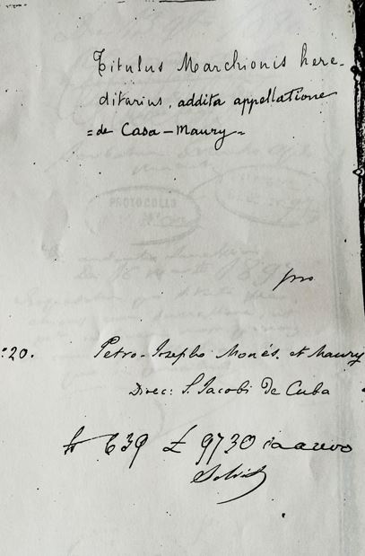 L’any 1989, vaig rebre copia d’aquesta documentació què. ara comparteixo, corresponent a un dels llibres del Pontificat del Papa Lleó XIII, en el cual s’inclou l’expedient de demanda i concessió de Marquès de Casa Maury, com a títol pontifici.