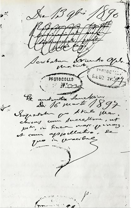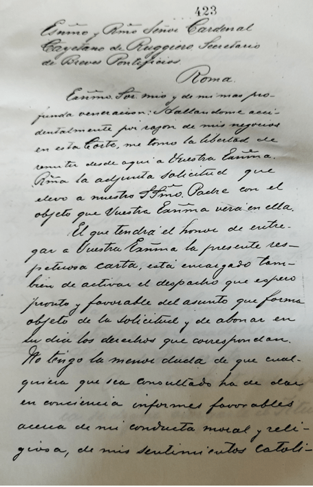 TRANSCRIPCIÓ : Excelentísimo y Reverendísimo Señor Cardenal Cayetano de Ruggiero Secretario de Breves Pontificios – Roma / Excelentísimo Señor mio y de mi más profunda veneración. Hallandome accidentalmente por razón de mis negocios en esta Corte, me tomo la libertad de remitir desde aquí a Vuestra Eminencia Reverendisima la adjunta solicitud que elevo a nuestro Santísimo Padre con el objeto que vuestra Eminencia vera en ella./ El que tendrá el honor de entregar a Vuestra Eminencia la presente respectuosa carta, está encargado también de activar el despacho que espero pronto y favorable del asunto que forma objeto de la solicitud y de abonar en su dia los derechos que correspondan. / No tengo la menor duda de que cualquiera que sea consultado ha de dar en conciencia informes favorables acerca de mi conducta moral y religiosa, de mis sentimientos católicos…