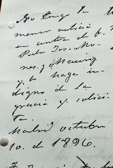 TRANSCRIPCIÓ AL MARGE DEL FUL ANTERIOR : No tengo la menor noticia en contra de D. Pedro José Monés y Maury que lo haga indigno de la gracia que solicita. Madrid, 10 octubre de 1896 – Firmado? Francisco? Arzobispo de Santiago de Cuba