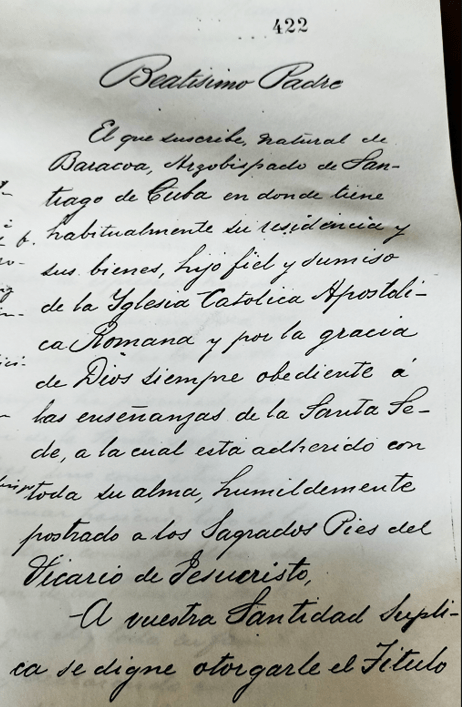 TRANSCRIPCIÓ : Beatísimo Padre / El que suscribe, natural de Baracoa, Arzobispado de Santiago de Cuba en donde tiene habitualmente su residéncia y sus bienes, hijo fiel y sumiso de la Iglésia Católica Apostólica Romana y por la grácia de Dios, siempre obediente a las enseñanzas de la Santa Sede, a la cual esta adherido con toda su alma, humildemente postrado a los Sagrados Pies del Vicario de Jesucristo, / A vuestra Santidad suplica se digne otorgarle el Título…