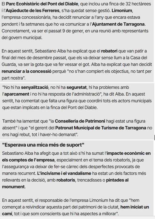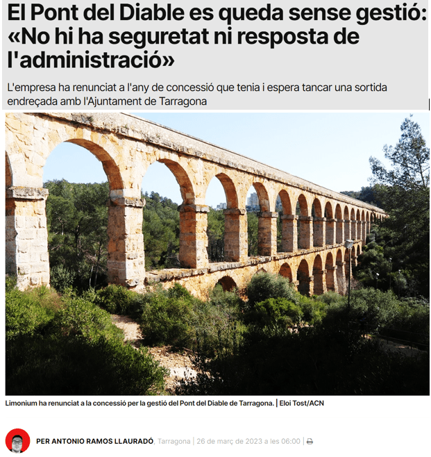 - La concessionària de l’espai de l’Aqüeducte/Pont del Diable de Tarragona no es veu amb condicions de continuar la mateixa i manifesta la manca de suport per part dels responsables del monument (notícia reproduïda més avall)