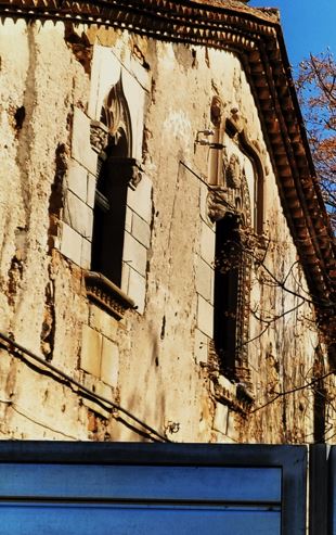 Imatge, del primer pis, de la façana de “Can Montcau”, amb una porta metàlica que impedeix veure-la, i l’estat de degradació de l’era….